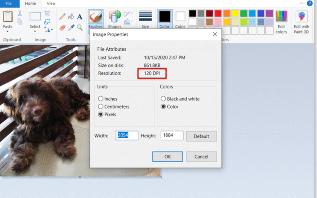 - Under Image, read off the Width, Height, and sometimes Horizontal/Vertical Resolution (DPI).